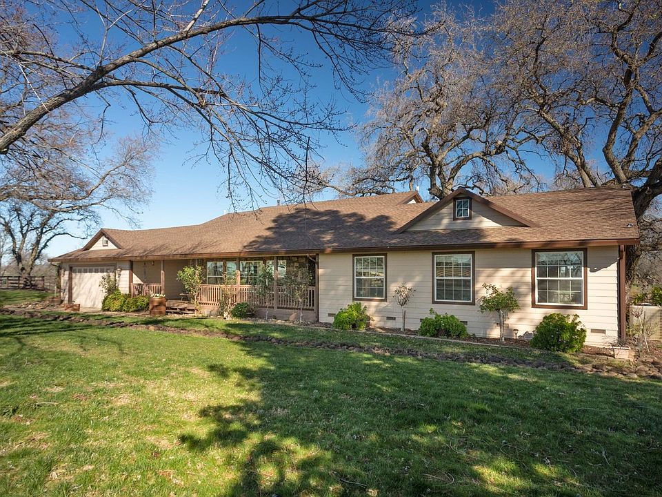 Gorgeous Loma Rica Home with horse set up! This beautiful property features 6.89 acres, with gated entry, 2538 sqft home with 3 bedrooms, 2 bathrooms, 2 car garage, wrap around deck, beautiful views and great layout with entertaining in mind. Lots of natural light and newly installed luxury vinyl plank flooring add to the open feel of the home. The oversized living room boasts vaulted ceilings and fireplace feature, the kitchen was just remodeled with freshly painted cabinetry and granite countertops, there is ample counter and cabinet storage, bar seating along with large formal dining space. Down the hall you will find two guest rooms, one of which is very large, guest bathroom, laundry and finally the master retreat with ensuite bath featuring dual vanities, spacious shower and exterior access. Head out to the deck, to enjoy the hot tub and outdoor entertaining space. Bring your horses or 4-H projects, the custom barn features drive thru breezeway, 5 box stalls, tack room, indoor wash rack w/hot and cold water, large lean-to for equipment/toy parking or hay storage, plus a round pen. The property is fully fenced and cross fenced and irrigated with pressurized BVID water. You will love the big views of the green pastures studded with large oaks and Paynes Peak in the distance.