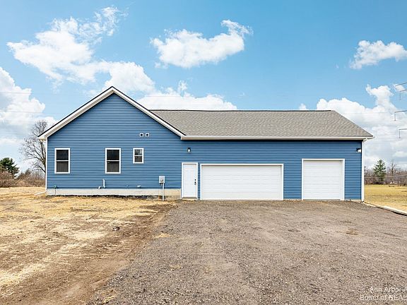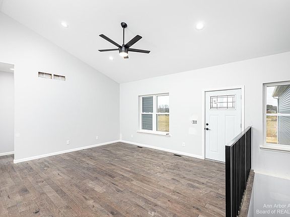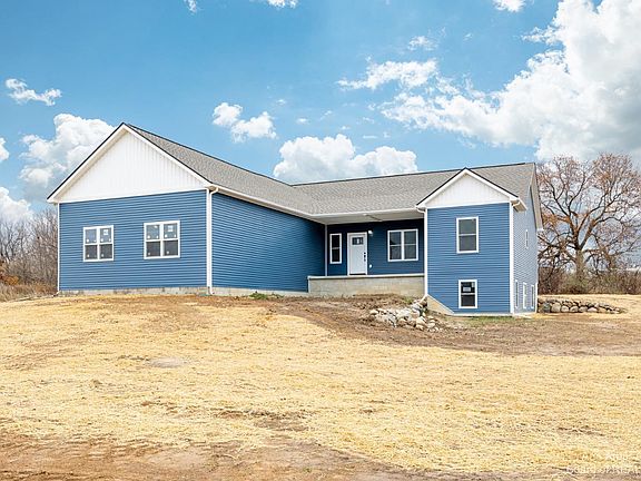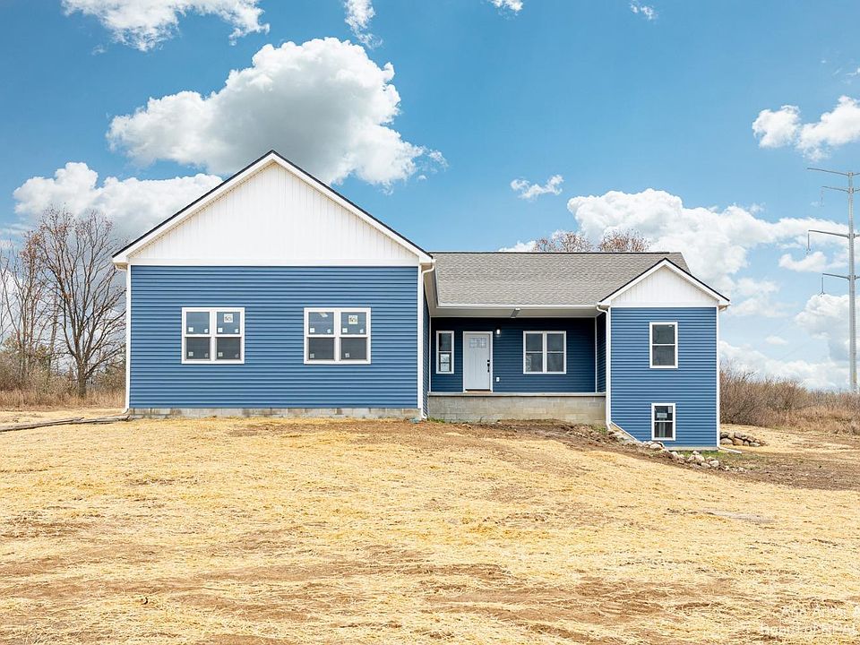 Perfectly designed NEW CONSTRUCTION home on nearly 5 acres is ready and waiting for you to make it your home! NO HOA means you can have your pole barn, or extra garage if the 35'x 24', 3 car garage isn't enough. NOTE! One of the garage doors is 8' tall so YES you can fit your crew-cab 4WD pickup truck inside. Rustic, Chelsea plank, hickory flooring through the entire house contrasts nicely with the white shaker cabinets, carrara-look quartz countertops and travertine flooring in the bathrooms.  5'6''x 3'4'' low curb shower and double sinks in the primary bathroom create your own spa.  The rest of the home has the desired open concept and split floor plan with additional bedrooms and another full bath at the opposite end of the house.  Hand-crafted metal railing leads to a daylight basement basement to finish if you need more space.  Front entry steps with black aluminum railing lead to a front porch large enough to accommodate a table and chairs!  Spend your evenings - and even rainy days - watching the wildlife in your front yard.  Home constructed to be highly efficient: 96% furnace, 2x6 construction, etc.,   Primary Bath, Rec Room: Space