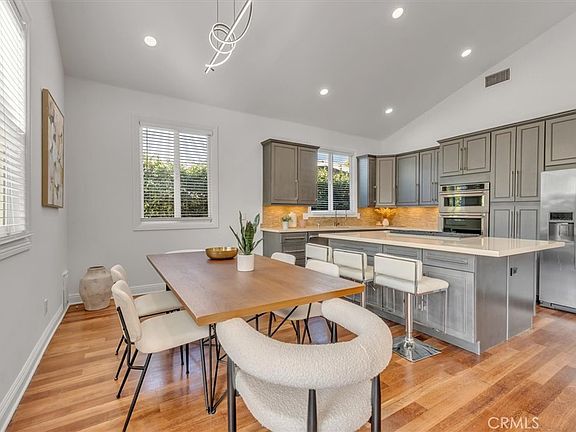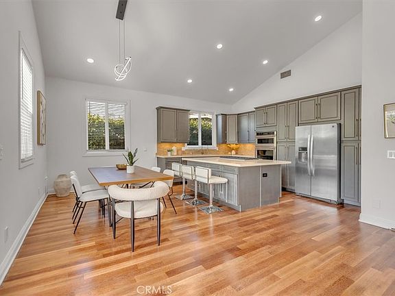 The modern eat-in kitchen showcases sleek quartz countertops, a central island with cooktop, stainless steel appliances, and a welcoming dining area overlooking the private patio and heated pool — perfect for indoor-outdoor California living.