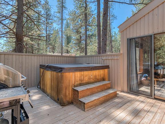 The upper level of this home features the primary bedroom, dining area, and a hot tub to relax in after a long day. You can enjoy a warm, classic Sunriver experience with the wood-burning fireplace and stunning stonework. The vaulted ceiling in the great room creates a spacious feeling that you'll love.