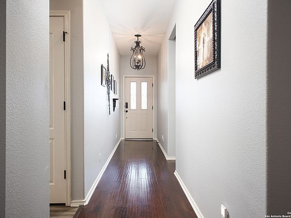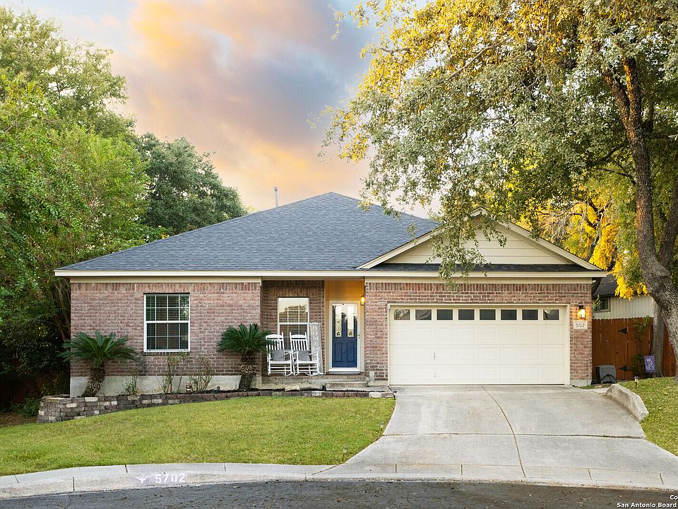 Discover this beautifully updated home in Woodridge perfectly situated on a spacious semi-cul-de-sac lot. The oversized backyard is an entertainer's dream, featuring an expansive deck ideal for outdoor dining, a designated fire pit area, and ample space for relaxation. Enjoy seamless indoor-outdoor living with lush landscaping and mature trees. Inside, you'll find an open-concept floor plan with high ceilings and rounded corners, creating an inviting atmosphere. Hardwood floors flow throughout, luxury vinyl plank in wet areas for a sophisticated touch. The upgraded kitchen boasts modern finishes and is open to the main living area, where plantation shutters provide privacy and style. The versatile 4th bedroom with an attached en-suite bath and private exterior entrance offers endless possibilities as an office, gym, playroom, or guest suite. The spacious primary bedroom serves as a peaceful retreat with a cozy sitting area and fireplace. Additional features include two fireplaces, a full sprinkler system, and proximity to USAA, UTSA, the Medical Center, and premier shopping at The Shops at La Cantera/The Rim.