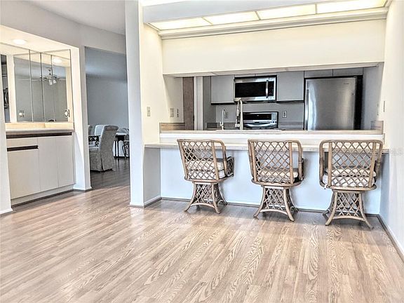 Long water views from this rarely available first floor end unit bright and light condo in desirable Avista @ Palm Aire! Two bedrooms, two baths, and extended one car garage make this condo ideal for full-time or seasonal living. Newer, easy care laminate flooring throughout the whole condo (except kitchen & baths which are tile. No carpet to be found here! Glass enclosed and spacious lanai with spectacular bird watching overlooking the water. Avista is well known for their large heated community pool and spa as well as ideal location within the optional and private Palm Aire Country Club. The club offers full golf, tennis, pickleball, fitness, and social memberships. Located west of I-75, you are just a short drive to the UTC mall, Benderson Park, SRQ Airport, downtown Sarasota, and our world-famous beaches. Shown furnished, owner will remove furniture at renter's request