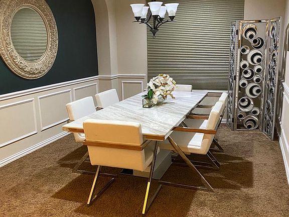 Custom high-end blinds, furnishings, and curtains throughout the house along with painted white ceilings.