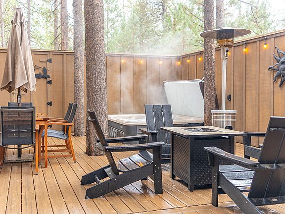 This cabin is a secret gem in Sunriver, close to The Village! Remodeled in 2021, this charming mid-century cabin is updated and modern. Enjoy the private enclosed deck nestled in the surrounding pines which doubles the living space. As you enter, you'll see beautiful beam ceilings in the two-story, open concept family room with a stacked stone gas fireplace. The kitchen is cheery and bright with stainless appliances, white tile backsplash and quartz countertops. The primary bedroom has French doors that lead directly out to the deck and hot tub. At the top of the original mid-century spiral staircase you'll find the loft bedroom with windows overlooking the deck below featuring its own updated full bathroom. Don't miss out on making this home your next smart investment and a cherished vacation retreat! Buyer to pay $450 SROA transfer fee.