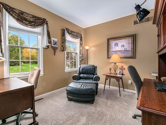 Welcome to this incredible 4 bedroom, 2 1/2 bath home. You'll love the space in this home, including a 12 foot ceiling in the living room, eat in kitchen and formal dining room. The beautiful kitchen has newly painted cabinetry, new granite countertops and backsplash, and a large island with seating. A separate den provides office space without using one of the 4 bedrooms. The primary bedroom suite is on the main level and features an expansive walk in closet and spacious bathroom with jetted tub. The laundry room is located on the main level for convenience. The basement has a huge finished family room with built in bookshelves and desk along with a built in bar for entertaining. The backyard features a multilevel deck to enjoy the beauty of Indiana nights. Bonus shed attached to the wide two car garage. Wide driveway offers room for three cars. Newer items include furnace, roof, AC, water heater, refrigerator, garage door, sump pumps, paint and carpet! All of this on a quiet cul de sac in a great neighborhood and just a a 5 minute walk to the elementary school! This location offers quick access to CR 17 and the US 20 Bypass making your commute a breeze.