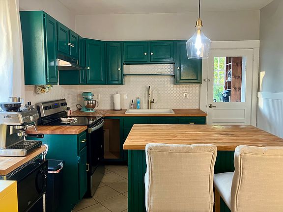 Large fenced backyardButcher block countertopsSpacious kitchenDeck for outdoor livingLarge windowsGreat natural lightOriginal hardwood floors
