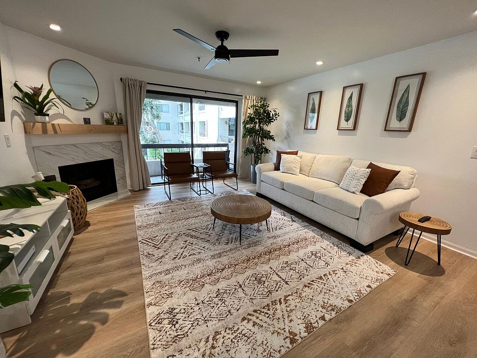 Living/Dining Room: couch, coffee table, LG smart TV, accent chairs, 3 bar height chairs, table w/ 4 chairs, wine cooler, in unit washer/dryer.