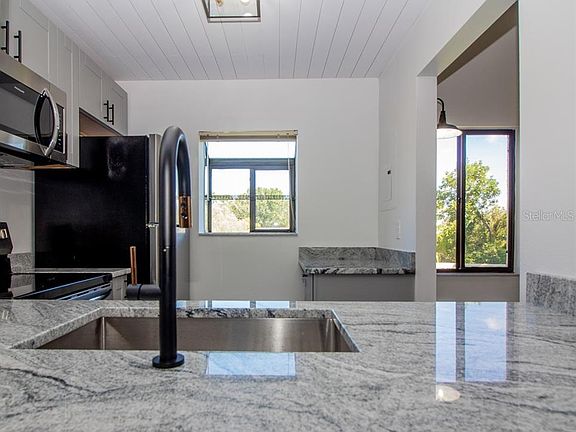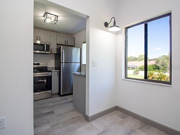 Check out this remodeled 1-bedroom, 1-bathroom condo in the Gardens of Palm-Aire! As you enter through the private entrance of this 2nd floor end unit condo, you'll be greeted by a uniquely tiled entry way and a refreshed staircase, leading into the spacious living room with high ceilings. You'll also notice the NEW kitchen with NEW stainless steel appliances, NEW cabinets, designer shiplap ceiling, NEW sink, faucet, and lighting. You'll be astonished by the exquisite granite countertops and modern light fixtures! The entire condo has durable laminate floor tiles and has been tastefully painted. The full bathroom has been completely updated with new shower wall tile, vanity, sink, faucet, and lighting. The bedroom is spacious and features a modern frosted barn door to the walk-in closet. Just off the living room, enjoy your screened patio with a view of the lush, green grass and mature oak trees. BONUS: This unit includes an indoor laundry with a stackable washer and dryer. No Stress here! The Gardens at Palm Aire is a maintenance-free community that offers a newly renovated community pool and tennis courts, and it's in one of Sarasota's best areas off University, close to UTC, Benderson Park, an abundance of restaurants, and Sarasota's beaches. This unit is easy to show and ready for a new owner to move right in!
