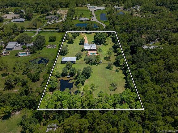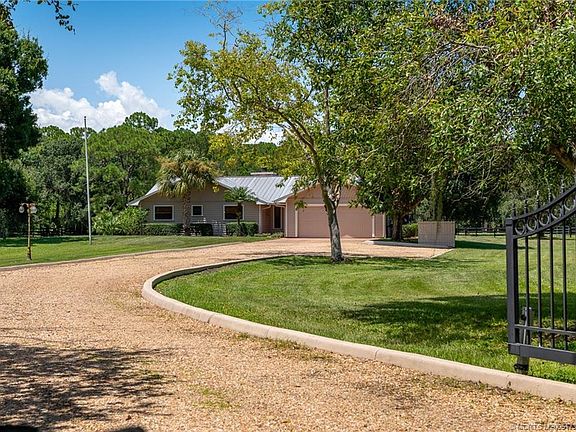 Welcome to this well-cared for 4BR/2BA home w/ extensive outdoor amenities. Enter through a gated driveway to a fully fenced property shaded by mature oaks draped w/ moss. Set on 5 acres, the property offers privacy, space & equestrian potential. Enjoy outdoor living w/ a screened brick-paver patio, open-air pool & massive 40x70 pole barn (perfect for hobbies, vehicles, or equipment) + additional storage shed. Acreage allows for plenty of room for stalls, paddocks, or a riding ring. Inside: A stone fireplace w/ mantle, well-appointed kitchen w/ SS appliances, granite countertops & ample storage. Extras include breakfast nook w/ property views, formal dining, laundry w/ utility sink & storage, & spa-style sunken tub/shower finished in travertine w/ more property views. Peaceful lifestyle in a top-rated school district. A rare opportunity to own your very own private retreat in Palm City Farms!