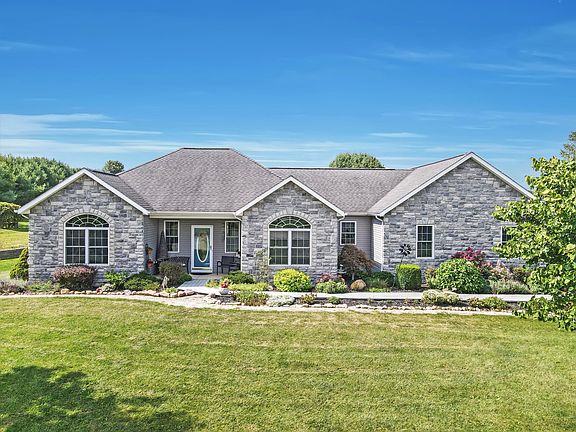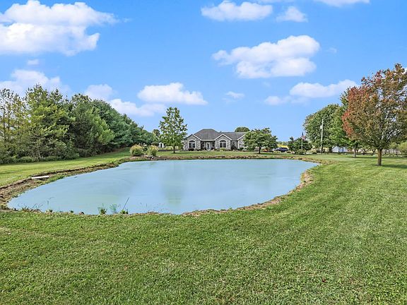 Fantastic secluded setting w/country views on 20.9 acres! Custom builder's own ranch home featuring 9' ceilings, an open floor plan & split bedroom layout! Inviting covered front porch overlooking your scenic pond. Spacious living room opens to the great room with gas log fireplace! Cook's kitchen w/plentiful cabinetry & S.S. appliances. Partially finished lower level for extra living space. Nice owner's suite w/dual sinks, walk-in shower, walk-in closet. Den/office could also be 4th br. First floor laundry w/cabinets & sink. Bonus 56x80 pole barn w/ high ceilings, 14' overhead door, 3 man doors, full bath, heat a/c in the workshop(s). Garden area. Deck w/gazebo. Fruit trees. Generac gas generator. Hay barn. Chicken barn. Bring your horses, animals & toys out to your everyday getaway!