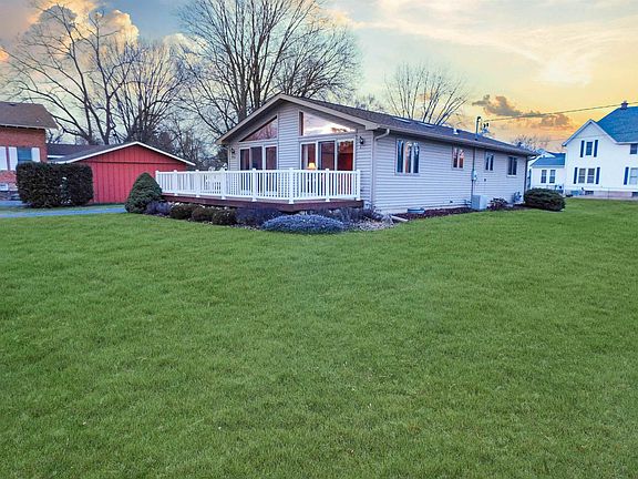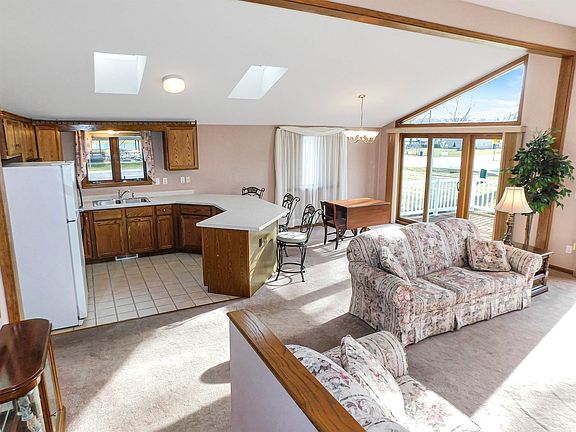 Wonderful well cared for ranch home in the Charming Village of Roscoe! Within the highly ranked Hononegah High and Roscoe Kinnikinnick School Districts! An open great room features an airy beamed cathedral ceiling along with huge windows and skylights allowing plenty of natural sunlight into the living space! Greet your guests in the tile entryway complete with a coat closet at the door. The kitchen is equipped with appliances along with plenty of cabinetry and counter space plus a big island with a breakfast bar and tile flooring. The formal dining space is just off the kitchen and features big windows and a new sliding door out to an expansive deck! A main floor laundry closet is conveniently located just adjacent to the kitchen. The main bedroom suite is spacious with a double closet and bathroom complete with tile flooring, a tub and second walk in shower. A second bedroom is good sized with big windows and a walk in closet. The lower level is unfinished providing tons of storage space and ideal to be used as a future living space. This home has a new roof, gutters, and 2 sliding doors plus a new water heater. A 1.5 car garage provides plenty of exterior storage and a huge deck is perfect to relax after a long day, grill out or entertain friends and family! The location is ideal situated on a big corner lot with Leland park across the street. Take a stroll just a few blocks to Roscoe's charming main street with restaurants, pubs, shops and services including a library, grocery store and post office very close by. Easy access to Rt 251, Rt 2 and 173 plus I90 all close by.