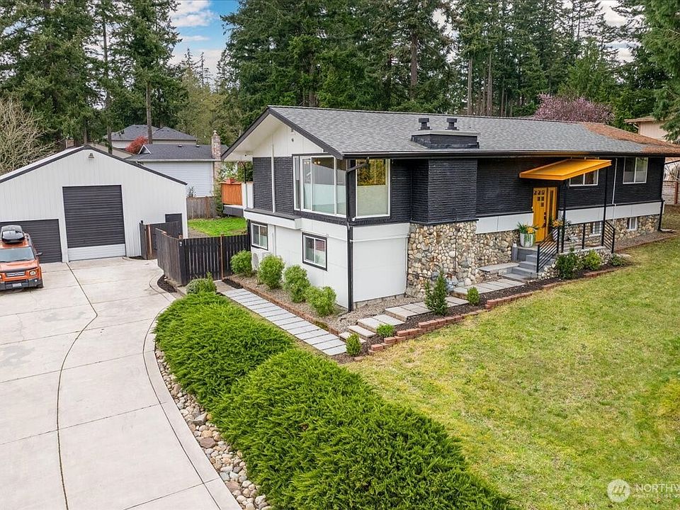 Experience luxury living in the coveted Picnic Point area of Edmonds! This impeccably updated home features a spacious, open layout on both levels, complete with individualized mini splits in every room. The upper floor offers 3 bedrooms, a gourmet kitchen with quartz countertops, sleek SS appliances, and elegant cabinetry. Downstairs, discover a stunning primary suite with a walk-in closet, spa-like bathroom with radiant floor heating, a second full kitchen, also a versatile den/office/nursery next to primary. Outside, the expansive lot boasts an entertainer’s patio with a louvered pergola, built-in gas grill, a MASSIVE shop 28'x30 (840sqft) loft 28'x 9.5' (266sqft) and wired for EV charger, RV parking, and so much more. A true must-see!