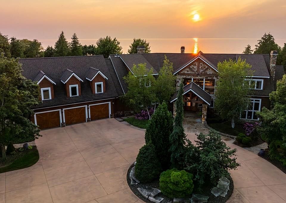Wake to the rhythm of lapping lake waters at this opulent waterfront estate. With 200' of bay side shoreline & 2.75 acres of emerald green grounds, privacy is abundant & the outdoor space rivals any five-star resort. Designed to optimize water views and make indoor-outdoor entertaining seamless, amenities include: chef's kitchen with cooking fireplace, pub, media room, game room, full fitness center, 4 season porch, 3 fireplaces, salt water pool & spa, dramatic fire features, outdoor kitchen & fireplace, 3 car heated garage with dog bath, heated outbuilding with workshop & fish cleaning station. You deserve to live in a home where it feels like vacation every day!