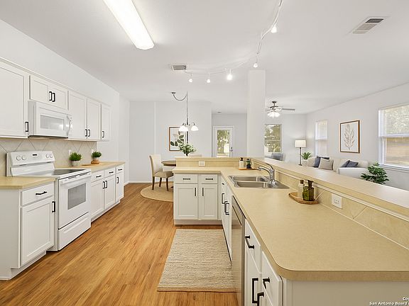 Located on a quiet cul-de-sac and corner lot in the Fairways at Scenic Hills, this well-maintained one-story Pulte home features the popular Orleans II floor plan with 3 bedrooms, 2 full baths, and a private home office with French doors. Recent updates include new hardwood flooring, brand new carpet, fresh interior paint, updated blinds, recent water heater, and smoke detectors. The open kitchen offers bar seating, ample storage, and connects seamlessly to the living and dining areas-perfect for gatherings. The spacious primary suite includes a walk-in closet and a renovated bath with dual vanities, a soaking tub, and a walk-in shower. Enjoy the oversized covered back patio with ceiling fan, mature trees, gutters, and a large, enclosed workshop or storage space. Foundation & plumbing upgrades recently completed with a transferable warranty. With no Bexar County taxes, recent landscaping, and access to top-rated Comal ISD schools, this move-in ready home offers unbeatable value and charm.