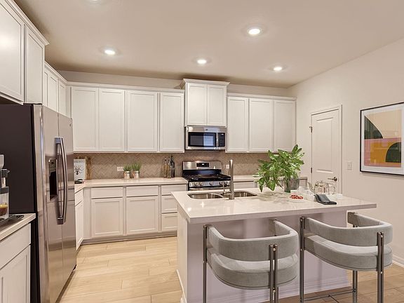 Sleek white cabinetsInviting living spaceBuilt in shelvesBrand new appliancesCovered patioElegant quartz countertopsGenerous walk-in closet