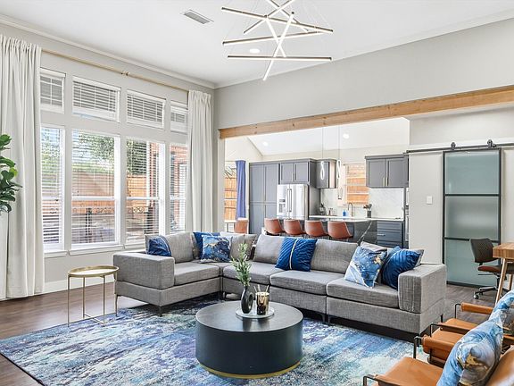 Thoughtful designer elements and artwork have been sprinkled throughout to give you a relaxing, upscale living room atmosphere. With an electric fireplace and calming tones of gray and blue, this living room will beckon you to sit and stay a while.