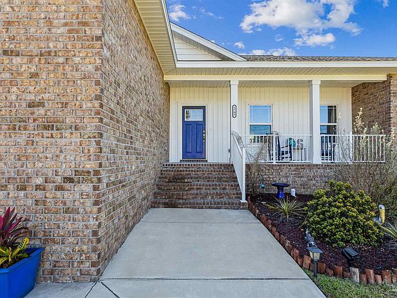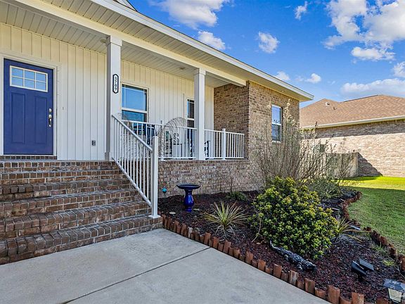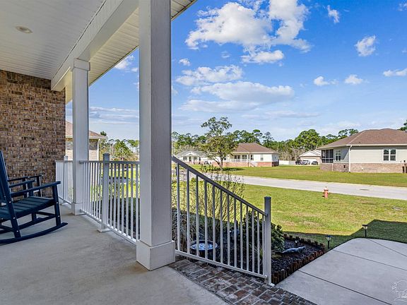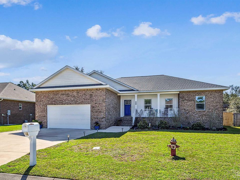 This beautiful 3-bedroom, 2-bathroom energy-efficient Earth Cents Home offers a spacious open and split floorplan, perfect for both comfort and privacy. The large kitchen is the heart of the home, featuring a spacious island with a breakfast bar, granite countertops, and ample custom cabinetry. Throughout the main living areas, you'll find beautiful wood-look tile, while the bedrooms are cozy with carpeting. The great room seamlessly flows into the dining area, with French doors leading to the covered patio and pool deck—ideal for outdoor entertaining. The backyard is ready for outdoor Florida living, with a swimming pool, featuring a concrete pad, firepit area, and a privacy fence, creating a secluded retreat for relaxation and fun. The oversized 2-car garage offers plenty of space for storage and vehicles. Located in a prime area, this home provides easy access to nearby boat ramps for water enthusiasts and is just 10-15 minutes from Gulf Breeze, Pensacola, and Pace. With Pensacola Beach only 30 minutes away, this location offers the perfect balance of convenience and coastal living. Don't miss out on this exceptional property!