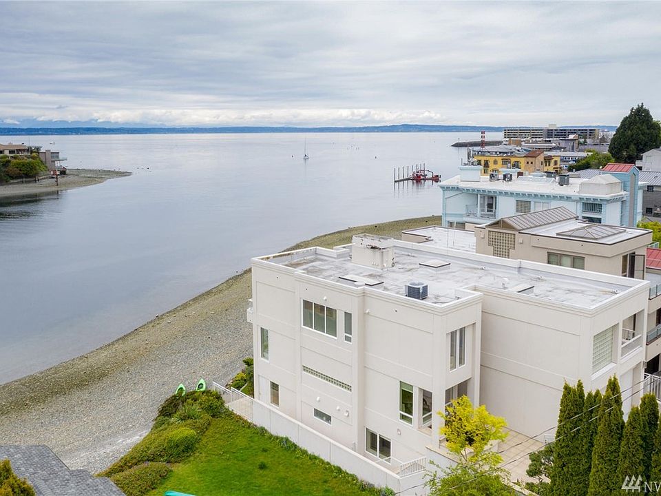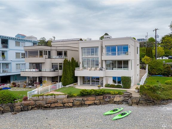 Beautiful views of Puget Sound and Olympics from stunning 3-level contemporary with 50+/- of medium bank waterfront on ship canal. Built in 1993 with clean lines and gated entry courtyard with koi pond. Soaring 2-story foyer; living/dining area with open floor plan; kitchen with adjoining family room and informal dining area; 3 bedrooms and 3+ baths, including master suite with sauna; 3 fireplaces; office; media room; lower level quarters with kitchen; wine cellar; AC; attached 2-car garage.