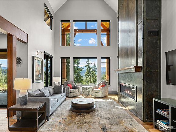 Custom mountain modern retreat in the gated River Ridge neighborhood, overlooking the Cle Elum River corridor. Exceptional craftsmanship throughout. Enter through a pivot door with tile entry, leading to stunning mountain views. Living room boasts timber beams, natural light, & floor-to-ceiling metal fireplace with custom Sandalus Leather quartz slab. Main floor features primary bedroom with a slider to covered porch & an office/den with mountain views. Upstairs offers 3 ensuite bedrooms, loft, & ensuite bedroom above the garage. Downstairs, enjoy a wine room, wet bar, TV/media area, & concrete epoxy floors. Equipped with 32 solar panels for efficiency. Outdoor living space with gorgeous sunsets and views, perfect for year-round enjoyment!