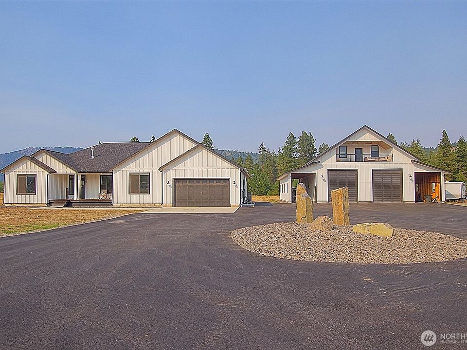 Surrounded by mountains, the views from this farmhouse style rambler, set on 3.44 acres, are simply breathtaking. However what is equally breathtaking is the massive new 60x40 shop that includes a 2bd 1ba 1200sqft DADU, an owners office & enough storage space to park just about anything you can think of. At 2576sqft, w/4bd 2.5ba the main home combines open plan living w/functionality. The kitchen's equipped with a huge island, quartz countertops, SS appliances & a Butler's pantry & is complimented by a spacious living room & huge rec room/flex space. All of the bedrooms are well appointed and the Primary as a beautiful ensuite and a walk-in closet. Surely this is one of those rare properties that has everything you're looking for.
