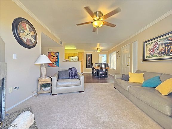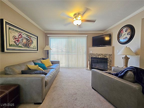 This bright and inviting condo offers 2 bedrooms + den, 2 bathrooms, and 1 assigned covered parking space. Featuring an open layout, lots of natural light, granite counters in kitchen and bathrooms, fireplace in living room, spacious primary suite with walk-in closet, balcony, and a large den that could easily be converted to a third bedroom by adding a closet. Nestled in the Canyon Willow complex off Tropicana and Boulder Highway. This neighborhood has two community pools, clubhouse, exercise room, and is gated with roaming security. This is a must see!!!