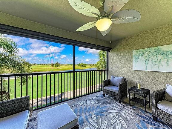Under contract-accepting backup offers. Within short distance to first-class amenities, this golf-front Veranda is what you have been waiting for. No reality check needed, this newly listed property is strategically priced and will check all your boxes. Just near the putting green or one of seven community pools, this location doesn’t get any better. No golf cart needed! Rarely available, this upstairs end-unit is the largest of the Veranda floorplans offering 1,569 square feet of open-concept living with an abundance of natural light, two bedrooms plus a large den that includes a comfortable sleeper sofa, two full baths, an inside laundry room, large kitchen with stainless steel appliances and tons of storage, two large screened-in lanais and a one-car garage. The epitome of country club lifestyle against the serene backdrop of the picturesque, landscaped community of Lakewood National Golf Club with outstanding amenities, owners will enjoy no state income tax, near-ideal weather, legendary golf-oriented lifestyle with 36 holes of championship golf included, and a robust calendar of social and recreational activities. With a coastal contemporary flare, the interior boasts a blend of comfort and style and is being sold furnished. Enjoy scenic golf and water views while sipping your favorite beverage watching the sunset from your west-facing back lanai or enjoy your morning coffee at sunrise from your east-facing front lanai. Whether you’re looking for a full-time or seasonal home, this property offers an incomparable, elevated and serene living experience. Ownership includes a deeded golf membership to the desired and gated Lakewood National Golf Club, which has two 18-hole championship courses. Amenities at Lakewood National Golf Club include a zero-entry heated main pool with cascading waterfalls and lap lanes, six additional satellite pools throughout the community with one just next to this unit, a poolside tiki bar and café, a stunning 28,000 square foot clubhouse with fine and casual dining, conference and event space, ladies’ and men's locker room and lounge areas, fitness center with group exercise classes, an on-site full-service spa, eight lighted Har-Tru tennis courts, bocce, pickleball, a fulltime lifestyle director and more. Ranked #1 by Golf Advisor, the Commander Course is home to the annual Suncoast Classic which is part of the Korn Ferry Tour. The Piper Course is ranked #4 by Golf Advisor. Lakewood Ranch is ranked the #1 community in the country, encompassing 50-plus square miles filled with dining, arts, entertainment, shopping, nature and recreation. A-rated schools, easy access to Interstate 75 and historic downtown Bradenton, Sarasota and Tampa, and conveniently near world-class beaches, spectacular shopping, great restaurants and entertainment. There is no better location than Lakewood Ranch and no better community than Lakewood National Golf Club.