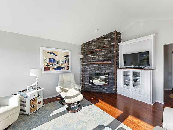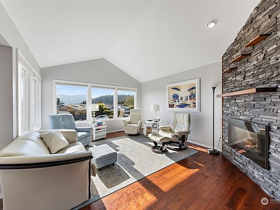 Nestled in the highly sought-after Skyline community, this stunning home boasts captivating views of Burrows Island, the bay, and marina. The living room features a beautiful stone gas fireplace, vaulted ceilings, and picture windows that bathe the space in natural light. The expansive kitchen features a cooktop island, ample counter space, and a cozy eat-in nook. The primary suite serves as a private retreat, complete with a luxurious ensuite bathroom that includes a jacuzzi tub, double sink vanity, and plenty of space to unwind. Outdoor living is at its finest with a large deck ideal for hosting gatherings, plus a covered patio for year-round enjoyment. This home is just a short stroll from Washington Park, the beach, and the marina.