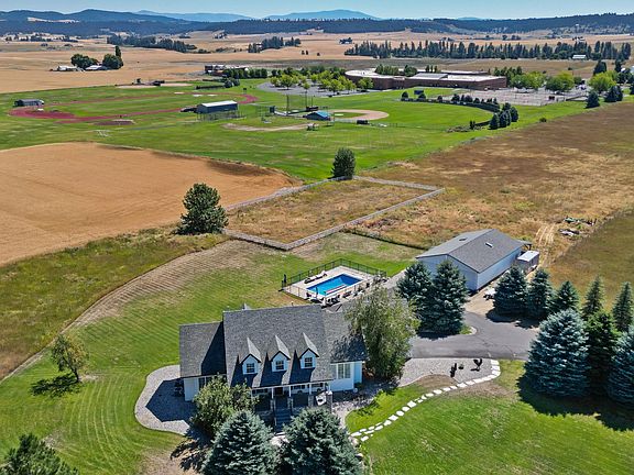 Spacious country retreat on 10 ac tucked away on a cul-de-sac in Mead! This well-appointed home features 9' sculptured ceilings, lrg comfortable living spaces & French country design. Chef’s kitchen boasts dbl ovens, built-in gas stove, infml dining space & island seating. Lovely fml dining rm conveniently located next to kitchen. Comfortable main flr living rm w/French doors lead to fantastic deck overlooking in-grnd pool & surrounding mountains. Grand main fl owner’s suite w/gas fp, lrg bath w/dbl sinks, tiled shower, generous closet. Upstairs are 2 bedrms w/adjoining bathrm, PLUS add’l lrg en-suite bedrm. In lower-lvl enjoy movie nights in theater rm w/built-in speakers & wet bar, add’l lrg en-suite bedrm, lrg office & rec rm area w/door leading to backyard & relaxing patio area. 40x60 shop contains a 25x36 bonus rm w/separate entrance, horse stall, tack shed & covered equipment storage area. Fenced 150x200 riding arena completes this incredible property making it the perfect escape from city life!