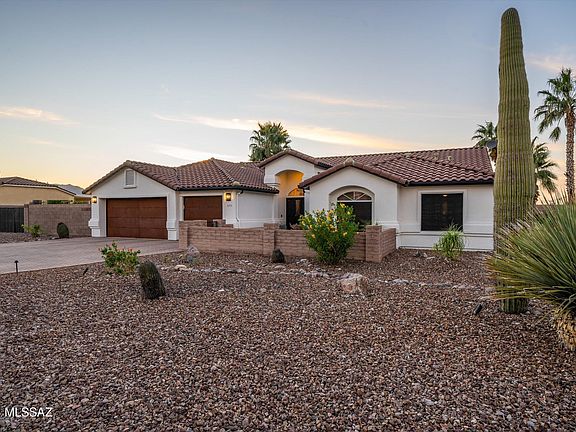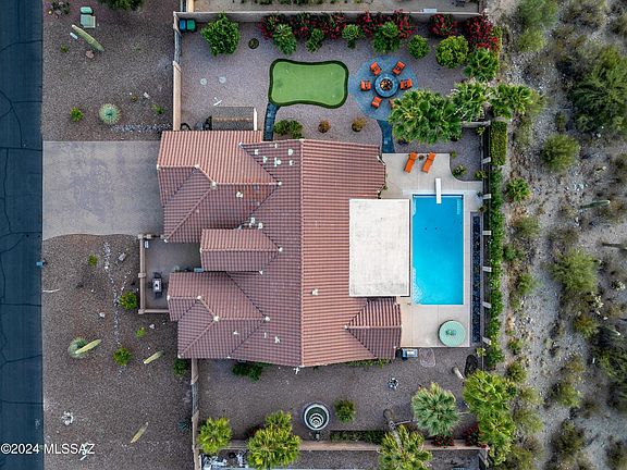 Stunning Santa Barbara style home positioned on a private 1 acre lot with gorgeous Tucson Mountain views. Beautifully updated with timeless finishes, this home offers a 3 bedroom split floorplan with office. Resort style backyard is an entertainers dream; extended covered patio, Jack Nicklaus designed putting green, heated pool with party light and walk on cover, enormous gas fire pit with conversation area, mature fruit trees and a view fence to enjoy the breathtaking views. Tons of storage in the 3 car garage and additional shed. Roof recently fully replaced and exterior painted. Very low HOA.