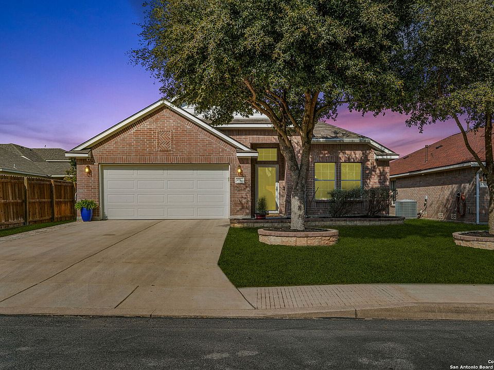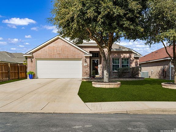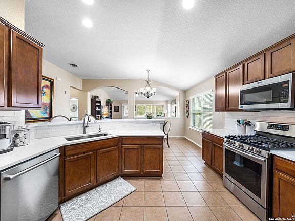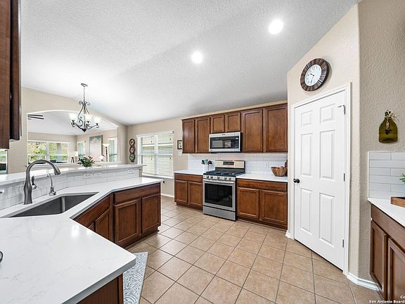 This meticulously maintained single story has lots of updates in recent years that sets it apart from all the others! The Kitchen has been updated with a new backsplash and gorgeous Quartz counter tops and all appliances have been replaced in recent years, including a gas stove. In addition, the fence has been replaced, sprinkler system installed, water softener installed, plus a New roof & new A/C installed in 2023! All ceramic tile throughout home (no carpet) including faux hardwood floor tile in living areas and all bedrooms! The home includes a spacious Primary Suite & bath with a soaking tub, separate shower and large walk-in closet. No neighbors behind the home - Enjoy sitting on the covered back porch looking at trees instead of the back of your neighbors house. The home is also walking distance to the pool and park and is located in one of the gated sections of Alamo Ranch for added security. Fantastic location close to everything you need - shopping, dining, Sea World and Lackland AFB!