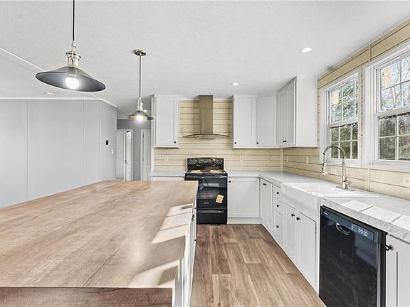 This stunning 3-bedroom, 2-bath modular home on a permanent foundation boasts a farm-style kitchen complete with a farmhouse sink, island, and a barn door pantry. It features fresh new carpet, durable laminate flooring throughout, and modernized with new heating and cooling systems. The home is equipped with updated appliances, double vanities in both bathrooms, a brand-new back deck, and a new front porch. Plus, there's a handy storage building included for added convenience.