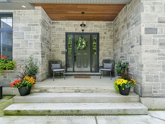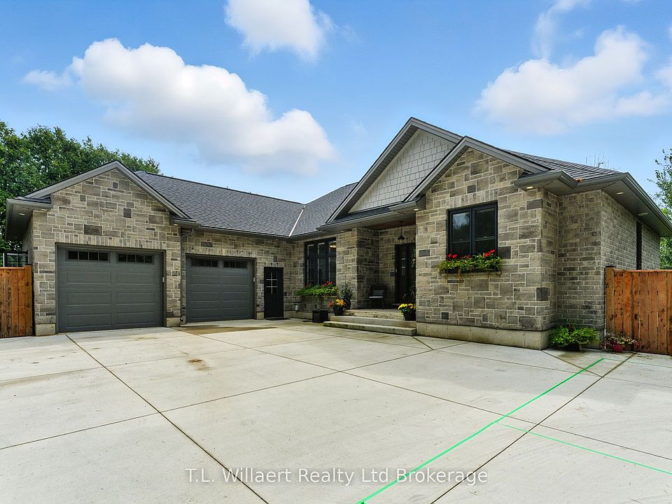 Stunning Modern Executive Home in Eden! Nearly 3,500 sq. ft. on a .79 Acre lot nestled in the friendly village of Eden, just south of Tillsonburg, this luxurious modern executive residence offers beautifully designed living space. Inside, an impressive open-concept layout showcases a custom chefs kitchen with marble countertops, oversized island, and premium cabinetry, flowing seamlessly into the elegant dining and living areas. A striking gas fireplace and expansive windows create a warm, inviting atmosphere filled with natural light. The primary suite is a private retreat, featuring a spa-inspired 5-piece ensuite with a soaker tub, walk-in shower, dual vanities and in-floor heating, along with a spacious walk-in closet. Two additional bedrooms, a 4-piece bath, and convenient main-floor laundry complete the thoughtful main level design. High-end upgrades include engineered LVP flooring throughout the main floor and exquisite finishes that make this home truly mesmerizing. The fully finished lower level is designed for both relaxation and entertaining, boasting a grand open-concept recreation room with custom built-ins and gas fireplace. The sophisticated wet bar with floating shelving, built-in microwave, wine fridge, and beer fridge elevates every gathering. A premium laminate finish, an additional bedroom, a luxurious 3-piece bathroom with walk-in shower, and abundant storage complete this remarkable space. Outdoors, enjoy the serenity of the private lot with mature trees, complemented by a large deck overlooking open fields and nature beyond the perfect backdrop for private entertaining or peaceful escapes. A spacious two-car garage offers ample parking and storage. Quietly situated on a dead-end street, near a local playground and scenic walking paths along a historic rail line, this property beautifully blends privacy, elegance, and small Village charm.