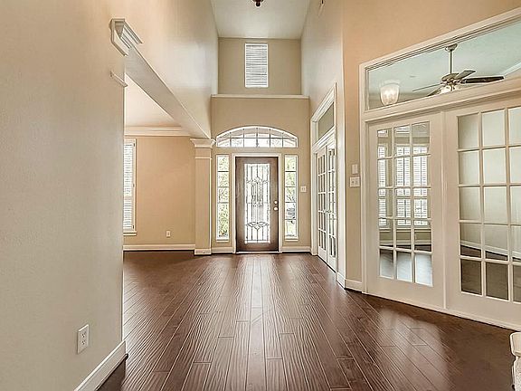 Hardwood flooringRock waterfallFormal dining roomLarge master suiteTwo story family roomGame roomStudy with french doors