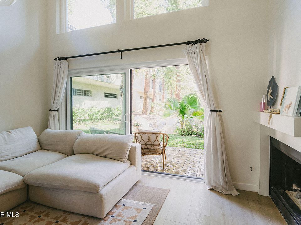 The open-concept kitchen remodel features custom cabinetry, premium Samsung appliances, quartz waterfall countertops, and a thoughtfully added pantry with custom shelving. Living room is spacious and bright with a fireplace for cozy evenings.
