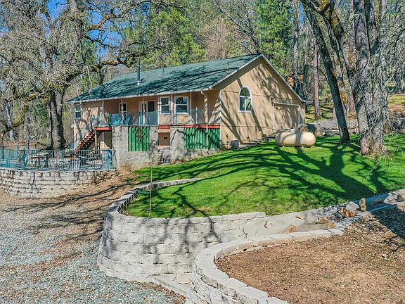 This lovely 3 bedroom 2 bath home on 2.23 acres has a fabulous and serene setting. Great location for family, working from home or entertaining. Located in historical Mountain Ranch, a wonderful community in Calaveras County and the Sierra Nevada Foothills. The interior offers an open concept with high vaulted ceilings and many windows for natural light. The master ensuite has dual sinks, jetted tub, separate shower stall and two walk in closets. The kitchen features quartz counters, hickory cabinets with Lazy Susan's and pull-out drawers, along with a breakfast/serving bar and large walk-in pantry all make this kitchen a chef's delight. Step onto your covered deck with inspiring views of your property and the beautiful stamped concrete patio below with fire pit, barbeque area and piped in music. For added ambiance there are lights under the grand oak and a creek that meanders along the edge of the property. A charming home with a comfortable floor plan and with more than two flat useable acres this property has endless possibilities. Complete with an attached two car garage, detached boat or RV carport and large concrete parking area. Enjoy the beautiful natural setting of the whispering tall pines and the shade of the cottonwoods along your own creek in this wonderful community with countless outdoor activities available for your enjoyment.