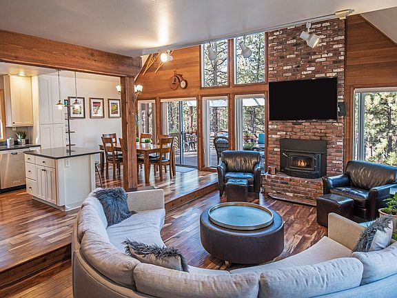 This classic Sunriver charmer has been thoughtfully updated with a modern touch! Quality, high-end finishes throughout this 2 bed, 2 bath retreat. Large great room features Acacia hardwood floors, soaring 2 story-windows, and a wood-burning fireplace with brick surround for cozy nights. The kitchen has been remodeled with white cabinetry, stainless steel appliances, and solid-surface quartz countertops. The expansive rear deck and outdoor space are elevated, giving you a treehouse-like feel and extreme privacy. Hot tub, pergola, and sunshade add to your outdoor living experience! Metal roof and heat pump will keep you and your guests comfortably cool in summer and warm in winter. Upstairs features 1 bed, 1 bath, and a loft for additional guests. Bonus room in garage would be perfectly suited for use as a home office or extra flex/sleeping space. Home has been used as a primary residence, but could be used as an STR. Rental projections and list of furnishings available on request.