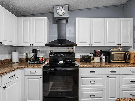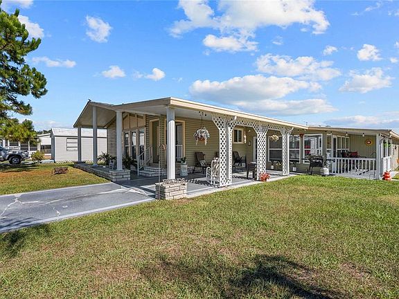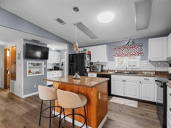 Welcome to 5718 Arrowhead Drive in Betmar Acres, Zephyrhills’ premier 55+ golf community where you own the land. This inviting corner-lot home blends cozy farmhouse charm with modern sophistication, showcasing a stunning kitchen with crisp white cabinetry, granite-look laminate countertops, a stone-topped island, subway tile backsplash, a butler’s pantry, and sleek black appliances—all set on durable luxury vinyl plank flooring. This kitchen is truly a chef's delight!! The enclosed Florida room, currently used as the main living room, provides a light and breezy retreat with beadboard accents, tile floors, and windows that bathe the space in natural sunshine. There is also a small covered seating area off the Florida room as well; a great place to sit and enjoy the Florida sunshine and your favorite beverage. At the front of the home, the spacious living room with transom windows offers a welcoming spot to gather this room flows seamlessly into the dining and kitchen areas for effortless entertaining. At the back of the home, the generous primary suite is a restful haven with space for a king-size bed, laminate floors and a walk-in closet. The primary ensuite bath has had an impressive renovation boasting a walk-in tile shower with dual shower heads and benches, a new granite-topped double vanity, and tile flooring. Off the hallway, guests will feel right at home in the comfortable second bedroom and bath. Additional inside highlights include an inside laundry, vaulted ceilings throughout and a workshop area with golf cart storage. Outside you will find, vinyl siding with brick skirting, a 10x10 shed, a parking pad for an RV or vehicle plus plenty of extra visitor parking at the dead end side of the street. If this isn't enough for you, how about Betmar Acres offers three scenic nine-hole golf courses, two pools with hot tubs, 24 covered shuffleboard courts, 12 pickleball courts, and a vibrant social calendar—creating the perfect setting for relaxed living under the Florida sun. Call today--you don't want to miss 5718 Arrowhead!!