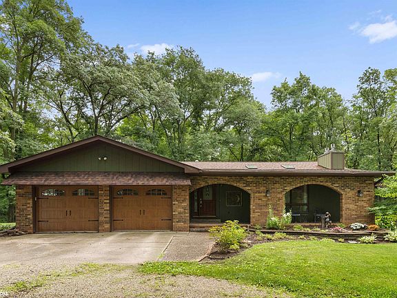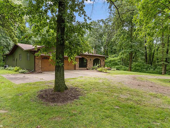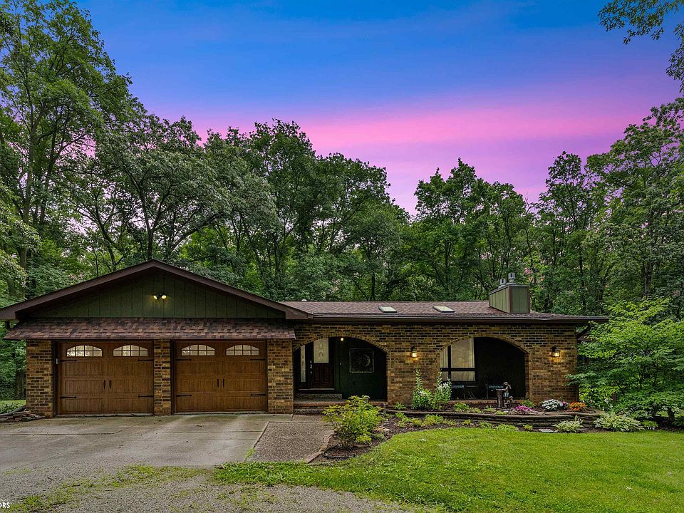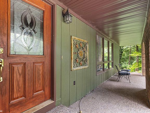 Situated on over 10 acres of mature trees this ranch features a lovely screened porch addition, great outdoor fire pit and walkway. The28 x 42 shop is heated and offers additional storage and 2 overhead doors. Step inside the entry from the porch and enjoy the open concept with gas log fireplace, custom cherry kitchen, dining area and access to the screened porch. Down the hall are 2 bedrooms and full bath as well as the primary bedroom with ensuite bath and sliding glass door to the composite deck. The lower level offers work area, storage and full bath plus an amazing family room with custom built ins and a 2nd kitichen! There is a wood stove that can be used as a secondary heat source. This area offers walkout to the amazing wooded backdrop. Two car attached garage.