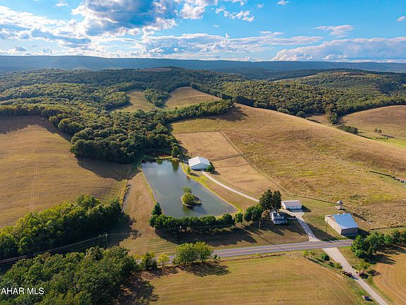 At the heart of the property lies a massive, private pond that feels more like a shimmering lake, a rare natural treasure where every step around the shoreline feels like entering another world. For those seeking even greater views, a gentle hike to the hilltop reveals a magnificent stone pavilion, crafted with stately pillars and a grand stone fireplace. From here, the eye travels 11-12 miles in every direction across pastures, treetops, and open sky-unmatched vantage point of Bedford County's landscape.
