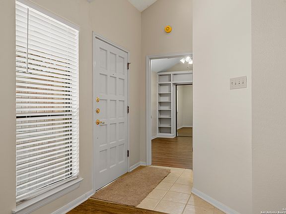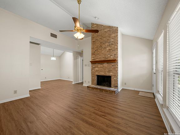 Discover a charming 2-bedroom, 2-bathroom residence nestled in the sought-after neighborhood of Spring Creek. This inviting home boasts an airy open floorplan complemented by soaring ceilings in the main living space. As you enter, be greeted by newly laid vinyl plank flooring that gracefully extends through the family room and adjacent bedrooms. Unwind by the cozy fireplace in the family room, which seamlessly flows into the kitchen and adjoining dining area, is ideal for effortless entertaining. Natural light streams through the skylight in the kitchen and dining area, enhancing the warm ambiance. The kitchen offers ample countertop space with a breakfast nook. Retreat to the serene master suite, thoughtfully situated apart from the secondary bedrooms for enhanced privacy. Double doors from the master suite lead to the outside. The secondary room has built-in shelves, mirrors on the sliding closet doors. Step outside to the backyard oasis, perfect for hosting delightful weekend BBQ gatherings. Randolph AFB and SAMMC are just a short drive away. Don't miss the opportunity to experience this inviting abode firsthand! Will be a pleasure to show your clients.