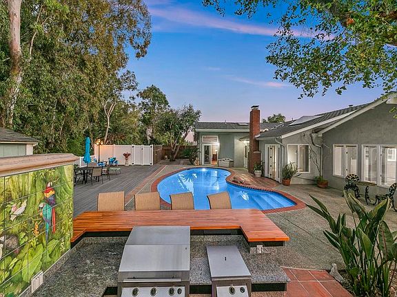 Unique & incredibly well-maintained single-level Vista propertunity with sparkling pool, large entertaining deck, outdoor kitchen/bar, & amazing privacy with no neighbors behind! Located within 5 minutes of Bub Williamson Park & 4.5 miles to the beach, this home boasts wonderful curb appeal from the moment you drive up. Loaded with charm & period details including hand-made Terracotta tile flooring, wood built-ins, a brick-surround wood-burning fireplace in the living room, beautiful beam ceilings, skylights, & arched doorways, if you have been looking for something truly special to come on the market in North County, this is it! Step inside & the formal entryway leads to the expansive & light-filled living room with glass French doors that open to the backyard pool area. Skylights in the vaulted, wood-beamed ceiling let the light pour in. You will love relaxing & entertaining in this space with its gorgeous red-brick fireplace. The floor plan flows seamlessly from one room to the next & features 3 bedrooms & an office area that could be a 4th bedroom, den, homework space, or game room. The kitchen has a great layout & abundant cabinet storage. The adjacent dining nook is charming with a built-in china cabinet & beautiful wood details all set beneath a ceiling fan to keep this space cool all year long. The primary suite is huge with more of those beautiful Terracotta tile floors, a walk-in closet, & an en-suite bath with porcelain soaking tub, separate walk-in shower, & plenty of wood cabinet storage. Enjoy personal access from the primary suite to the backyard oasis through sliding glass door. From the large backyard pool to the recently rebuilt outdoor kitchen to the shower that is perfect for rinsing off after a long swim or day at the beach, this is the San Diego dream property you've been waiting for. Live like you're on vacation every day! The outdoor kitchen features a new teak bar top, a new 5-gallon hot water heater, & new glass door refrigerator. The ceramic-fired mural in the kitchen area was done by Pamela Simpson, known for her bronze busts of the cast of the Clint Eastwood movie, Rawhide. Mature trees surround your expansive backyard oasis. Right behind you is a Federally Protected migratory bird area, ensuring the lush plant life, tranquil nature sounds, & privacy will remain. Recent updates by seller include complete painting of interior, new exterior lights, new closet doors & smoke detectors installed in bedrooms, smoke/carbon dioxide sensor in hallway hardwired in, & new carpet installed in 2 of the bedrooms. Notable other interior features include Anderson casement windows & operable skylights, porcelain bathtubs, HVAC replaced in 2007, roof replaced in 2005 with a 50-year warranty, & hot water heater replaced in 2021. The redwood side fence was recently rebuilt & a section of the attic had insulation removed & new insulation installed after cleaning. Termite, home inspection, & NHD done & available for your review! Located at the end of Collyn, enjoy the quiet & peace of living on a pseudo cul-de-sac (not a through street) while being close to great shopping, dining, & annual entertainment in the city of Vista. This property should not be missed if you're looking for a wonderful home to enjoy for years to come, one that includes more character & soul than the average new build home in San Diego. Lovingly maintained & updated by the current owner, hurry & make this your new address!