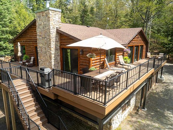 Escape to a world of tranquility with this stunning log home, a true retreat nestled by the lake. This serene property features 3 bedrooms and 3 bathrooms, ensuring comfort and privacy for all. A two-car garage adds convenience, while the exterior sauna by the lake offers the ultimate relaxation experience. Take a refreshing dip in the lake after your sauna session or warm up in the sauna after a cool swim. The steel girder wraparound deck offers breathtaking panoramic views, perfect for soaking up the summer sun. Multiple patio doors open directly onto the deck, creating a seamless blend of indoor and outdoor living with unobstructed lake views. Experience the serenity of a storm from the comfort of the three-seasons room, where you can unwind and enjoy the soothing sound of rain gently tapping on the metal roof. Inside, the expansive kitchen and dining area provide a beautiful view of the lake, making every meal a scenic experience. The adjoining living room is ideal for hosting guests, complete with a wet bar for refreshments. This large, yet cozy living space features a beautiful fireplace, adding warmth and comfort. For outdoor entertainment, the property features a charming "tiki hut" where you can whip up margaritas for your guests as they enjoy the various outdoor adventures. Whether you’re enjoying the peaceful ambiance of the sauna, the stunning lake views from the deck, or the inviting atmosphere of the home, this log home offers the perfect retreat into serenity.