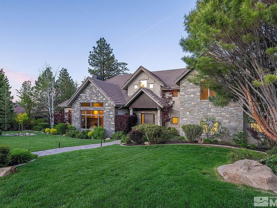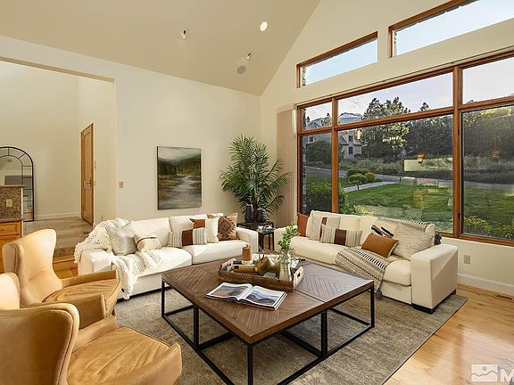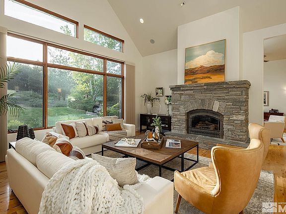 Serenity awaits. This beautiful home is situated on a quiet, peaceful cul-de-sac in the pines, not too far from the Montreux gates. The bright & cheery main level features a gracious entry, high ceilings, formal living room w/stone fireplace, dining, greatroom off the kitchen, office w/custom cabinetry, wine cellar, spacious main bedroom suite w/fireplace, & hickory flooring throughout. Family kitchen includes KitchenAid appliances, & plenty of counter space., Upper level offers 2 more large ensuite bedrooms w/study areas & lofted family room. Relax & unwind to the sounds of a lovely water feature that will soothe your spirits. Summer evenings are delightful on the wrap-around private patio surrounded by pines, lush landscaping & protected common area. The design & flow make for easy living, w/different gathering spaces for family & friends. One of the best values in Montreux, Nevada's premiere, gated golf community nestled in pines on the east side of the Sierras between Reno and Lake Tahoe.