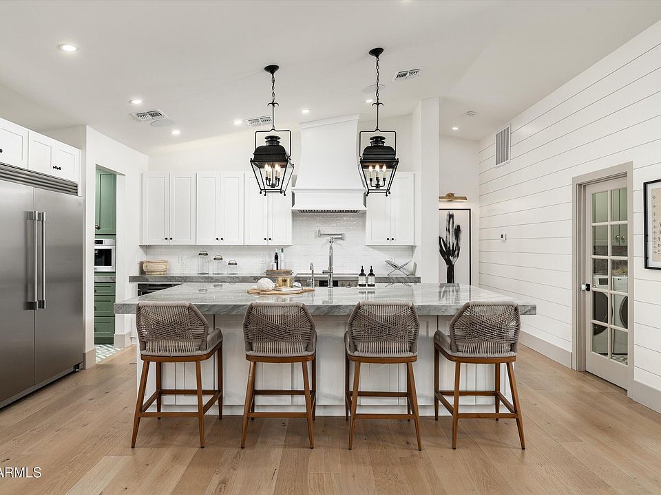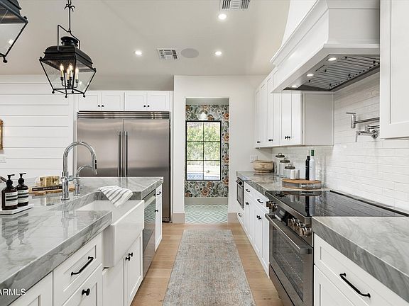Welcome to The Marilyn, a reimagined modern retreat in the coveted 85254 Magic Zip Code. Behind its timeless Spanish façade, this single-level home unfolds into light-filled spaces with soaring ceilings, wide-plank oak floors, and curated designer finishes. The chef's kitchen anchors the open concept with bespoke cabinetry, marble counters, and statement lighting, while a vibrant butler's pantry adds a playful twist. The primary suite is a sanctuary with spa bath and private access to the lush backyard. Entertain effortlessly with indoor-outdoor flow, a sparkling pool, and covered patio. A rare blend of style, function, and location, The Marilyn embodies modern desert living at its most elevated.