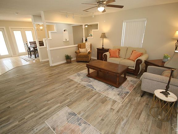 Open House Sat. 9-27-25, 1-4pm. BEAUTIFULLY UPDATED in 2025! This beautiful open-concept home has been COMPLETELY REFRESHED with all NEW luxury vinyl plank flooring, NEW blinds, fresh interior paint, NEW ceiling fans in every room, and a NEW water heater. The kitchen shines with ALL new appliances, granite countertops, disposal, sink & fixture. The home offers two spacious living areas ~ a living room and a family room plus four spacious bedrooms along a private hallway. The primary suite includes two walk-in closets and a completely remodeled bath, including tub/shower, new solid wood cabinets w/ Granite countertops, mirrors, light fixtures, toilet, tile flooring & bathroom fan. The hall bath was also fully gutted and redone right down to new towel holders. Step outside through double French doors to the 17 x 24.6 patio and shaded backyard, boasting mature oaks, an air conditioned SHE SHED, and a 12 x 10 separate YARD BUILDING with NEW flooring. The backyard is fully fenced and has tons of space for your RV & is complete with a 60 amp RV HOOK UP. The front porch is perfect for enjoying cool relaxing evenings in your rocker. Additional features/ upgrades ~ NEW receptacles & switch plates, NEW door knobs & hinges, NEW railing & post on front porch, NEW French Doors in dining room, Sod in front yard, asphalt driveway, all NEW exterior light fixtures, NEW paint on She Shed along with NEW windows, NEW window unit, NEW vinyl flooring, NEW roof & blinds. NEW ROOF installed on home 9/2021, NEW HVAC 7/2023 inside & outside. Termite Bond w/ Extreme Termite. This is a floor plan that feels much larger than the square footage suggests. This home is in walking distance to Gospel Projects Youth Athletic Club. This home is TRULY a MUST SEE!