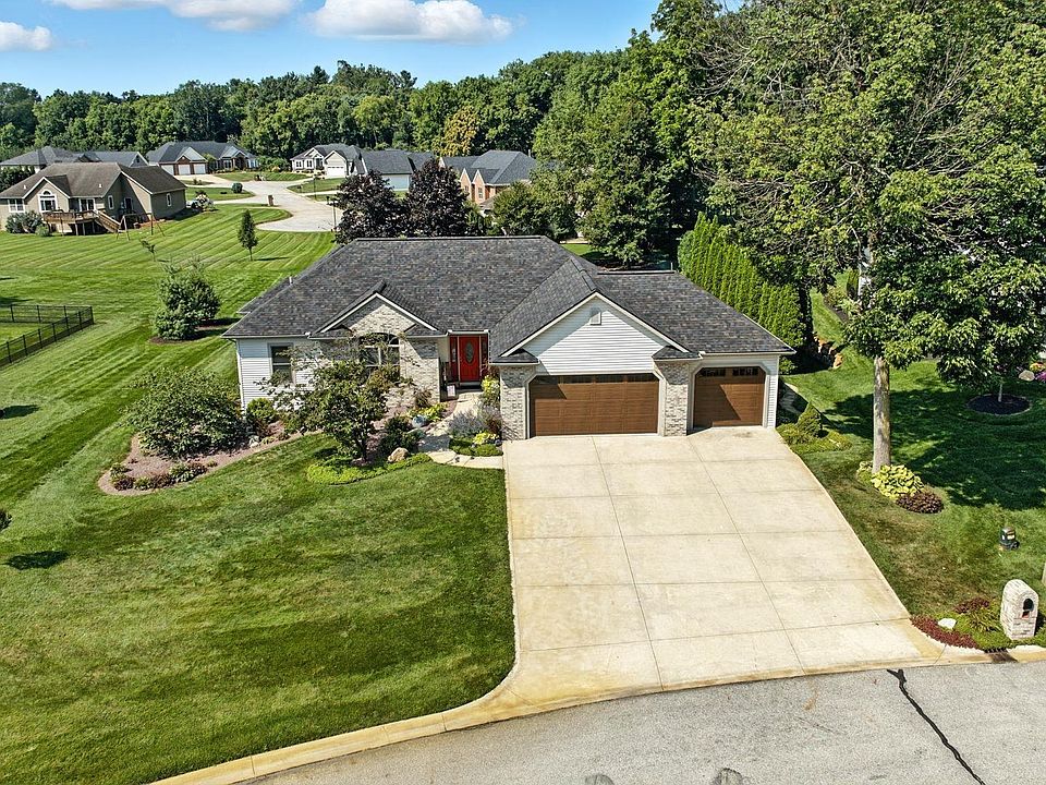 Welcome to 57207 Phaeton Place, where everyday living feels like a retreat. This beautifully maintained, single-owner home is tucked in one of Elkhart’s most desirable neighborhoods, where homes rarely come to market. Here, you’re not just buying a home—you’re joining a community that blends comfort, recreation, and natural beauty. Inside, you’ll appreciate the quality details: Marvin windows, 9’ ceilings, excellent insulation, and a cozy corner brick gas fireplace. The primary suite features a flexible four-season room—perfect as a private retreat, home office, or nursery. The kitchen is designed for both function and style with solid-surface counters, pantry with pull-outs, built-in desk nook, and a RO system. Major updates include a new roof with transferable 50-year warranty (2024), new A/C and microwave (2023), remodeled baths (2022), and a brand-new stainless dishwasher (2025). A finished lower level with daylight windows and workroom expands your lifestyle options. Outside the lifestyle continues. Entertain beneath the cedar pergola on the stamped concrete patio (reinforced and wired for a hot tub), gather by the double firepit, or sip morning coffee with sunrise views over the stocked pond. The heated, fully insulated 3-car garage is a dream for hobbyists, complete with hot/cold water, utility sink, floor drain, and canoe rack.Ownership of the beautifully maintained common area is included: a private stocked pond with fountains, a stone waterfall, and a ½-mile paved walking path. You’ll also enjoy direct access to the Elkhart River—perfect for kayaking, canoeing, or fishing. This lovely home offers both value and lifestyle. Don’t miss your chance to call Phaeton Place home. Schedule your private showing today!