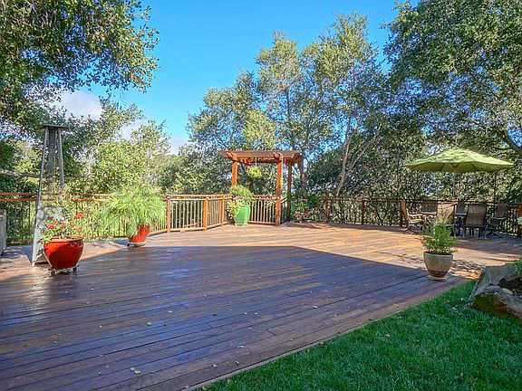 Located on a private wooded lot in prestigious Woodland Acres, this custom 5 bedroom, 4 bath, 4,700 square foot home was designed to incorporate the natural surrounding beauty with views of the nearby hills and gardens. Featuring a 700 square foot two story redwood deck boasting lounging areas, covered outdoor bar, food prep and BBQ area, imported Italian pizza oven and water feature, this home provides the ultimate in outdoor entertaining. Inside the home is no less impressive. Double leaded glass doors lead into the grand two story foyer illuminated by a sparkling chandelier and recessed lighting. The picture windows in the living room offer a view of the garden that allows you to enjoy the outside while indoors. The spectacular chef's kitchen features a Miele six-burner gas range, built in stainless steel double ovens, microwave, dishwasher and refrigerator. European cabinetry and large center granite island create a kitchen that will please any chef. Combined with the family room and formal dining room this home is perfect for family gatherings. The upstairs master retreat offers a serene escape and features a spa like master bath with heated marble floors, private balcony and beautiful views.