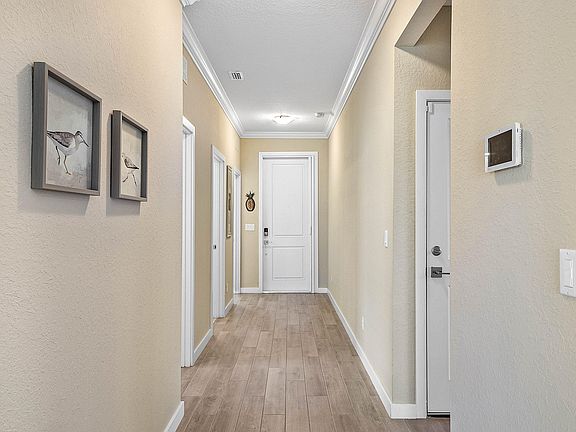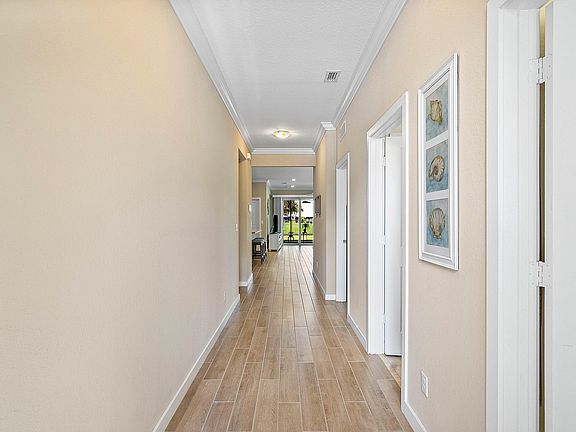 Low HOA Fees in the Quaint Gated Community of Canopy Cove This stunning 3-bedroom, 2-bath, 2-car garage home with a flex room is located in the highly sought-after gated community of Canoy Cove. Built in 2019, the residence offers a modern split floor plan and a variety of impressive upgrades. The gourmet kitchen features custom white cabinetry, granite countertops, and a center island with breakfast bar, opening seamlessly to the dining area and spacious living room--perfect for entertaining or everyday living. The private master suite at the back of the home offers tranquil golf course and lake views. Its ensuite bath includes dual sinks, a private water closet, and a custom walk-in closet. Additional highlights include crown molding, custom closets, faux wood tile flooring throughout, and impact windows and doors. The versatile flex room is ideal for a den, office, sewing room, or playroom. Step outside to a screened, covered porch and enjoy picturesque views of the golf course and lake, along with a variety of wildlife right from your backyard.