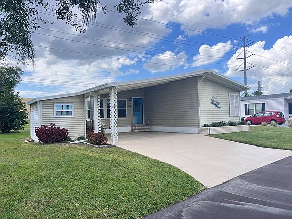 Camelot East Village, a gated 55+ community - This beautifully updated 2 bedroom, 2 bathroom home offers a well-designed living space on an oversized perimeter lot. The sought after split floor plan provides privacy, while the rare double carport adds convenience and extra outdoor living. The bright living and dining areas feature vaulted ceilings, fresh paint, and oak laminate flooring. French doors open to the screened lanai, perfect for enjoying the Florida breeze. The remodeled front kitchen has granite counters, cherry cabinets, ceramic tile, and a breakfast nook with a sunny view. The guest wing includes a large bedroom, full bath, and indoor laundry with washer/dryer. The private master suite features French doors to the lanai, a walk-in closet, and an en-suite bath with dressing area and step-in shower. Extras include a storage shed, 2018 HVAC, updated plumbing and vapor barrier (2012), 2010 roof, and new gutters. Monthly lot rent for new owners is approx. $1,600/ month and covers taxes, water, sewer, trash/recycling, lawn care, and irrigation. Camelot East Village offers resort-style amenities including a heated pool, spa, pickleball, fitness center, game rooms, outdoor kitchen, and year-round activities. All listing information is deemed reliable but not guaranteed and should be independently verified through personal inspection by appropriate professionals. Integrity Mobile Home Sales cannot guarantee or warrant the accuracy of this information, measurements, or condition of any property. Measurements are approximate. Lot rent is subject to change.