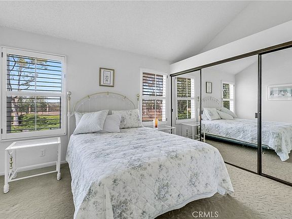 The living room is equally impressive, featuring a dramatic vaulted ceiling and numerous windows that create a bright and airy atmosphere. Both bedrooms also offer high vaulted ceilings. The primary bedroom includes a mirrored wardrobe closet with a wonderful closet organizer, while the second bedroom has mirrored closet doors, plantation shutters, and a pleasant view with partial city lights.